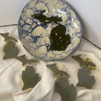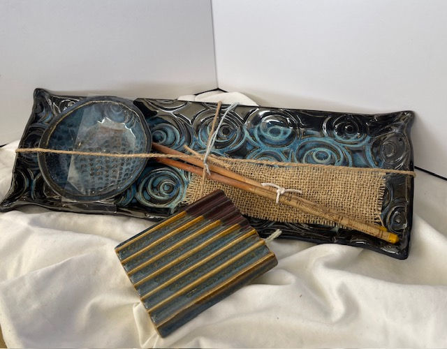 My creations are made from stoneware clay that is either wheel thrown, hand built, or a combination of the two. Initially, I fire to 1600 degrees. Pieces are removed from the kiln then glazed and fired again to 2400 degrees using food safe glazes.